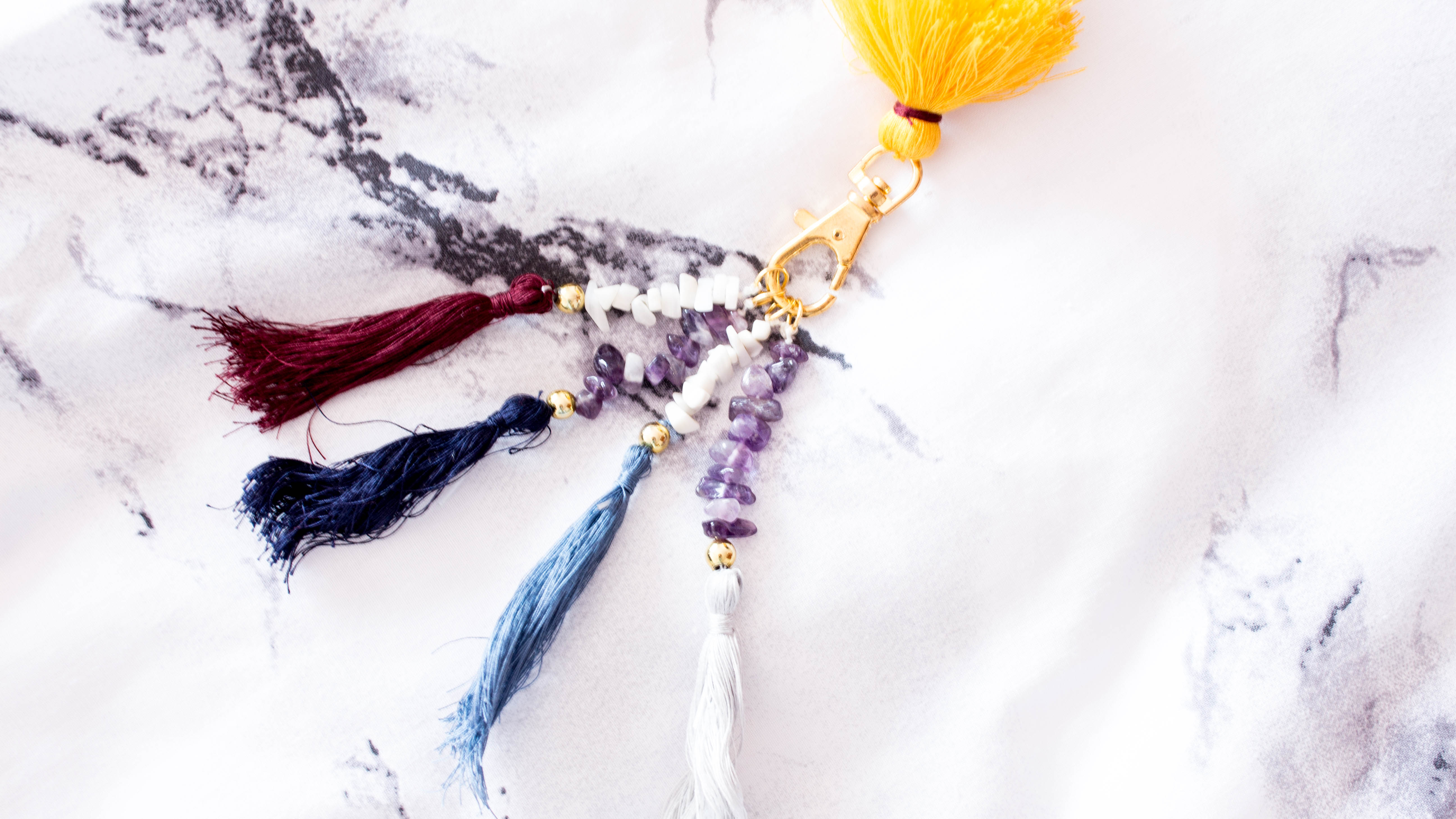 Step 4. In my case, the bracelet had a few gold beads that were perfect to make the transition from the tassel to the crystals. In the end, I think they look amazing if the jump ring and the key ring are gold as well.