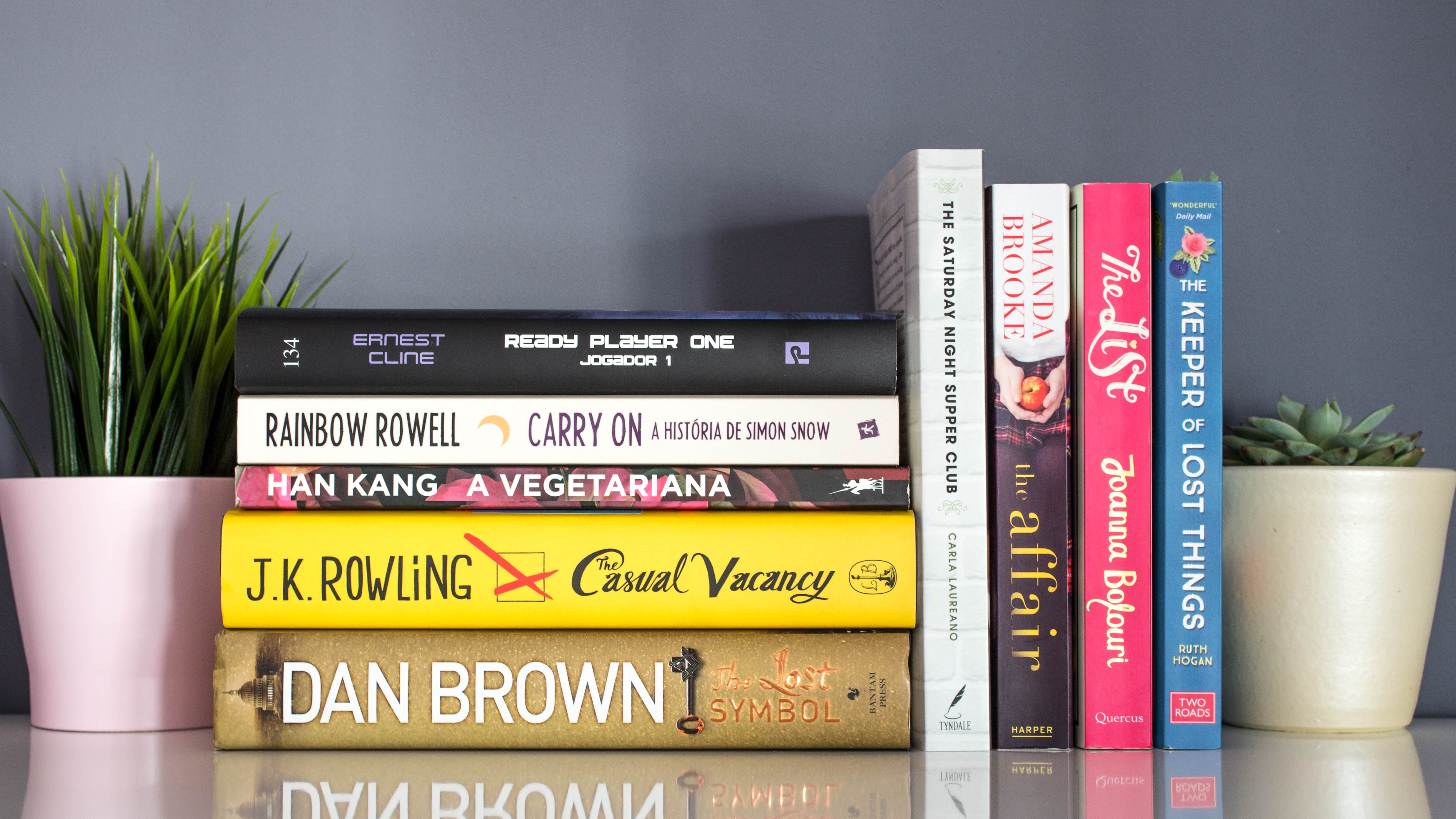 In the past weekend, I had a few bucks put aside and instead of upgrading my wardrobe I went to spend it all in books. I bought Ready Player One since the movie came out this week and I wanted to go to see it, also Carry On by Rainbow Rowell (the Portuguese cover is gorgeous), and The Vegetarian by Han Kang. Then I was surprised with a little bargain section outside of the bookstore so I also bought The Lost Symbol by Dan Brown and The Casual Vacancy by J.K. Rowling, which is my first book written by her.